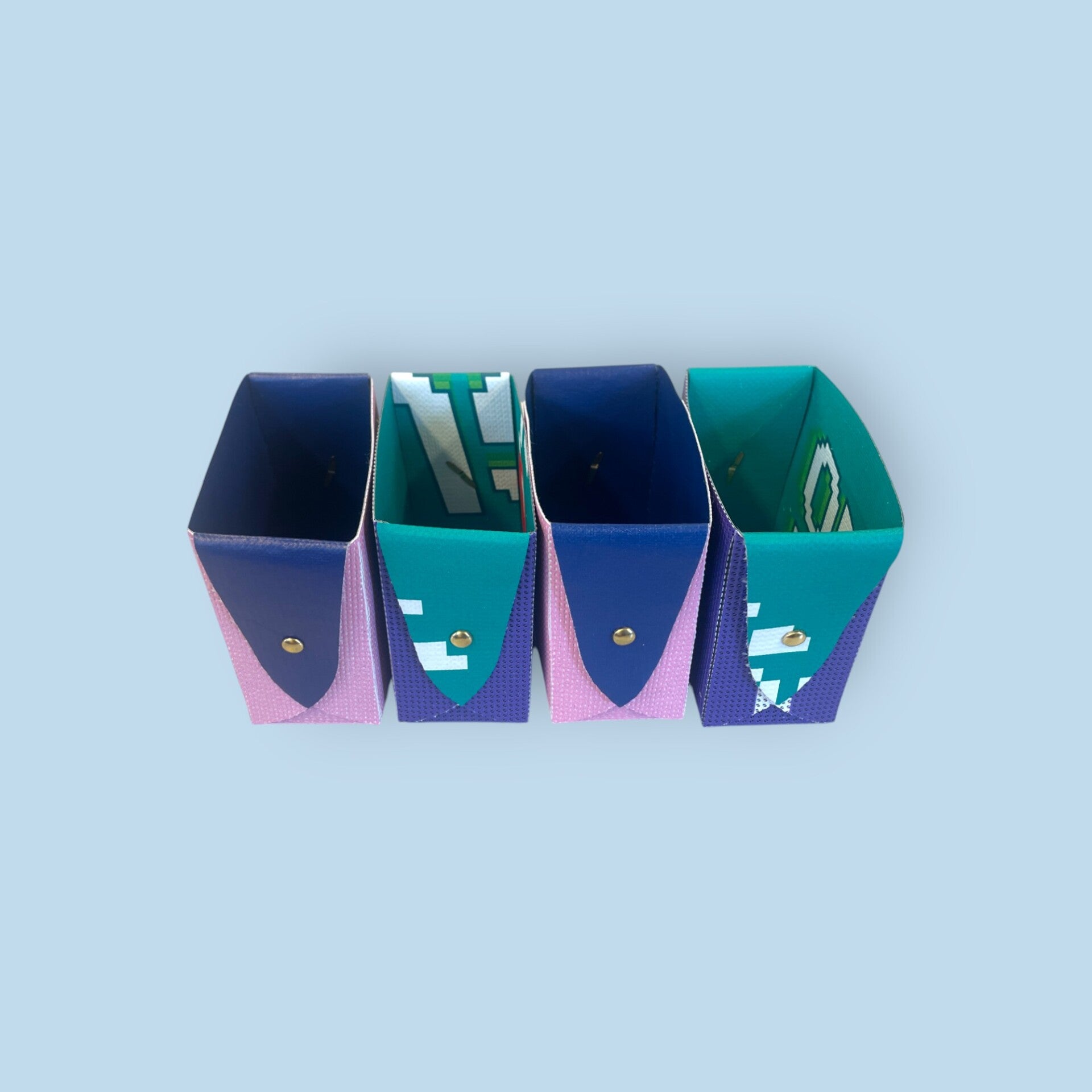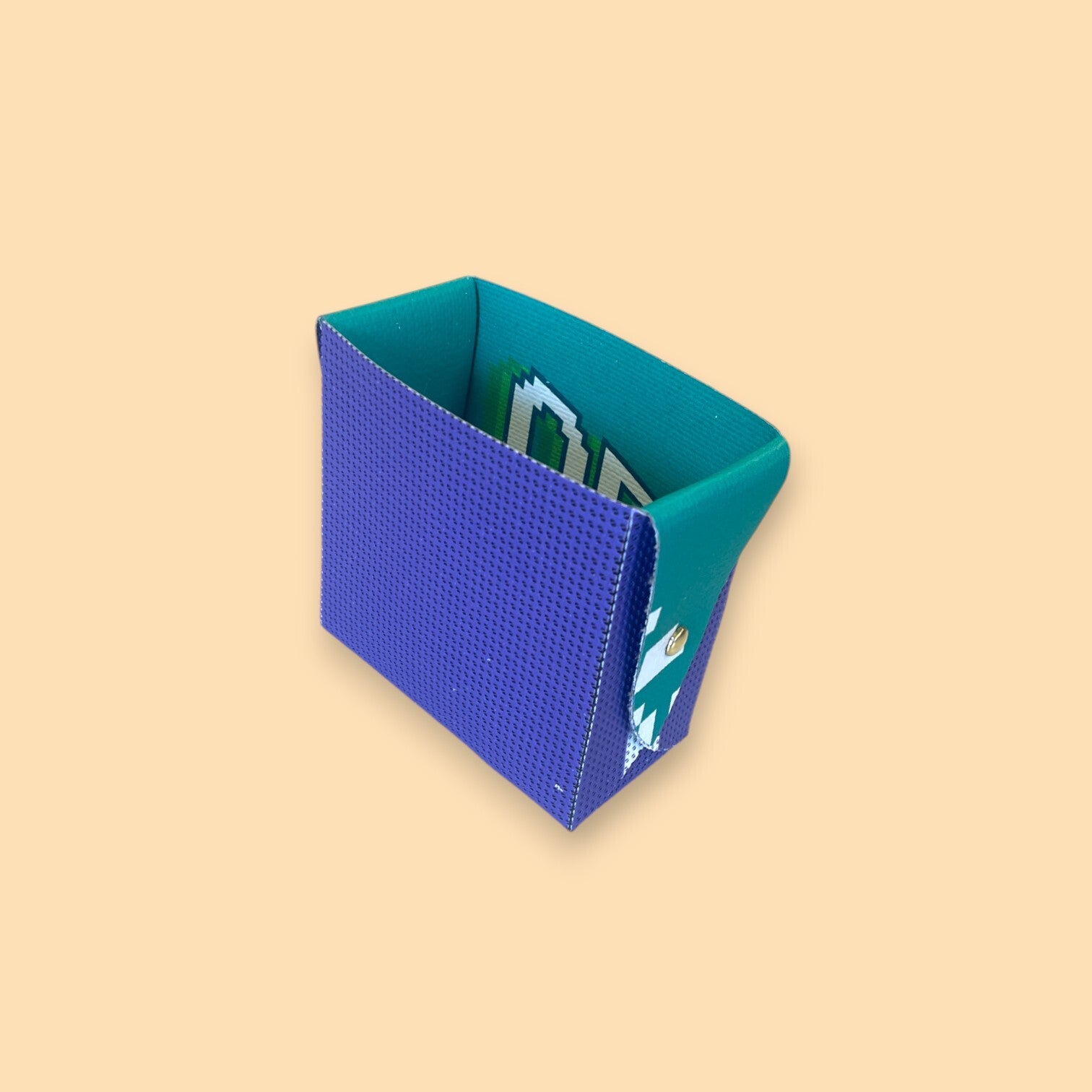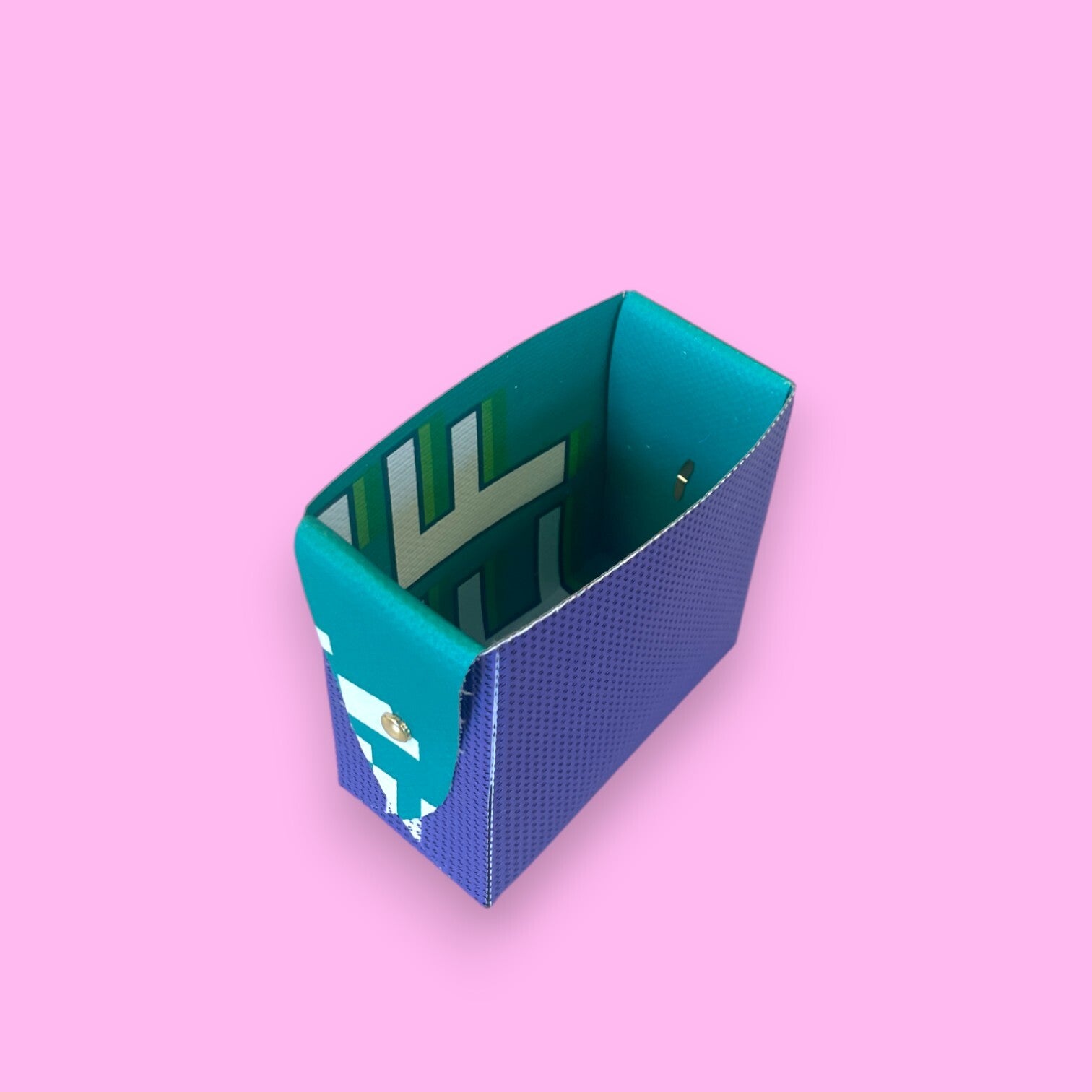 Pot à crayon format rectangle en bâche doublé et attache parisienne. Souple et résistant à la fois. Produit réalisé à partir de bâches de communication récupérées. Deux autres formats existent.