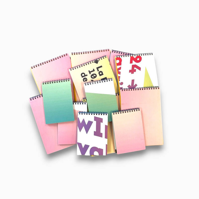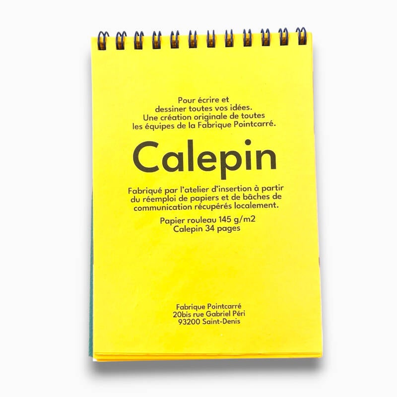 Calepin reluire métal. couverture en anciennes bâches de communication récupérées, pages intérieures en enveloppe, papier cyclo ou papier d'écolier. Deux formats : A5 et A6.